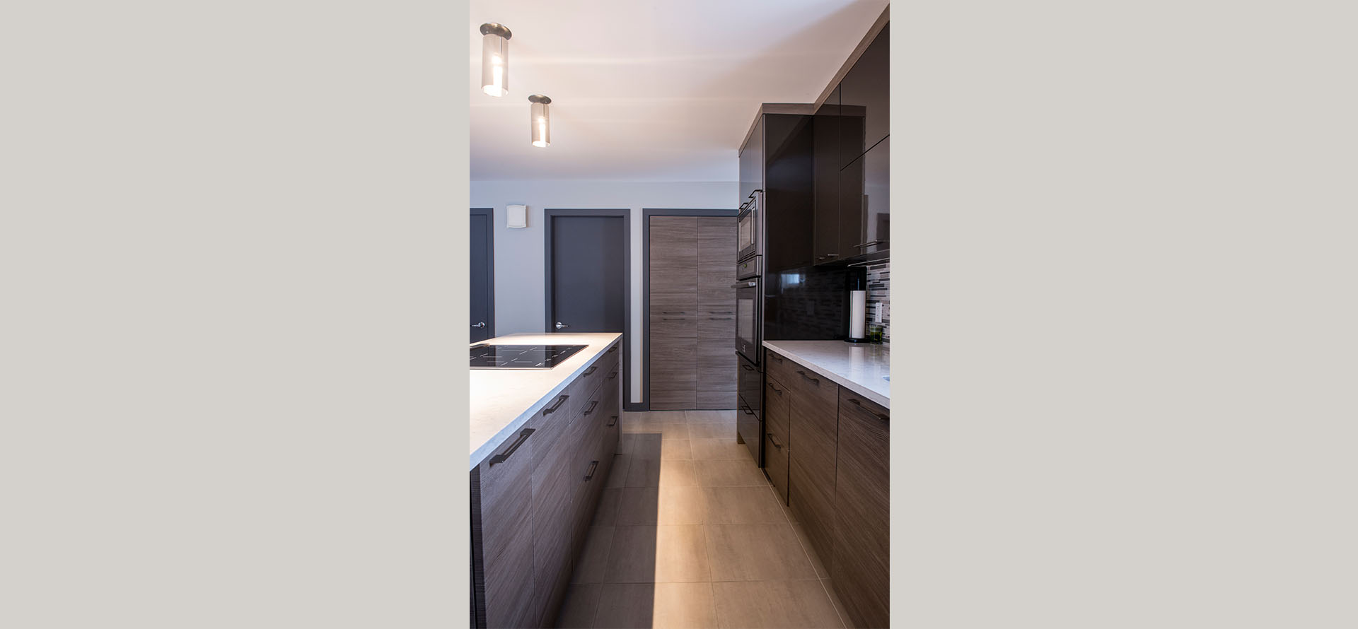 Cuisine moderne en mélamine au fini lustré et comptoirs de quartz